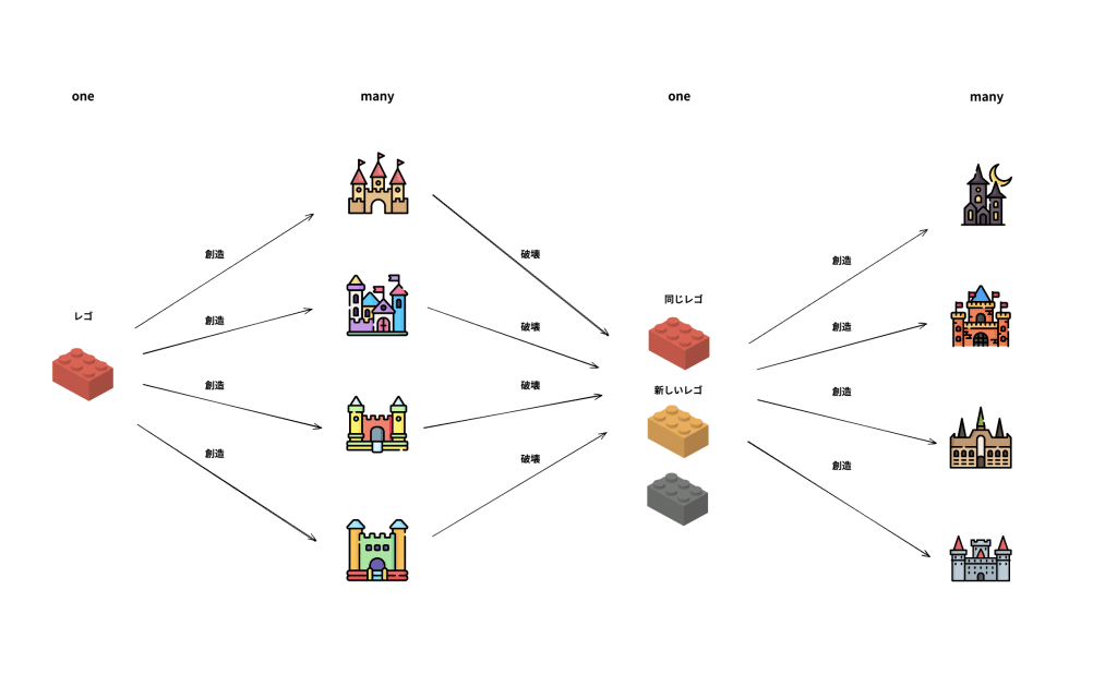 また、manyの中から新たなoneを抽出し、そのoneをまた別のmanyで使い回す。