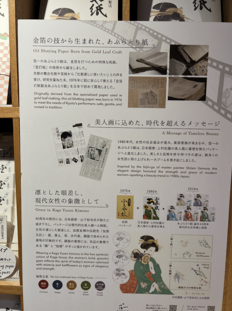 金沢の金箔職人が京都に金箔を納めに行く際に、お土産としてこの「ふるや紙」を芸妓さんたちに配ったところ、お風呂あがりのようにさっぱりすると人気を集め、やがて芸妓さんたちのお気に入りの化粧道具になったんだそう。
